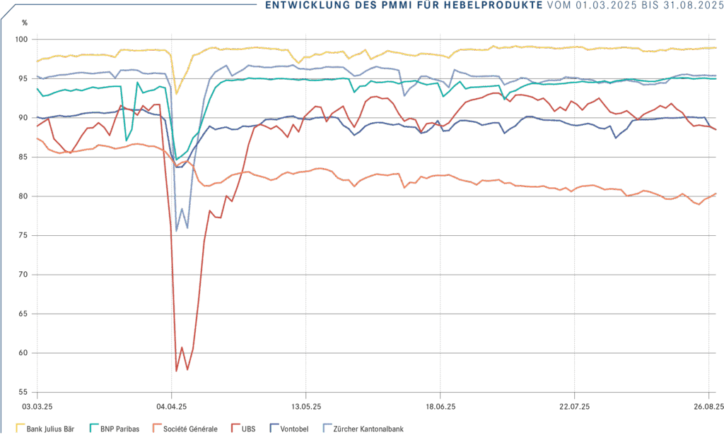 The PMMI provides a rough overview of the market making quality of the various issuers in the structured products segment. After a turbulent April, the issuers’ scores have continued to improve. For investment products, all issuers are above 90 points and three groups have formed.